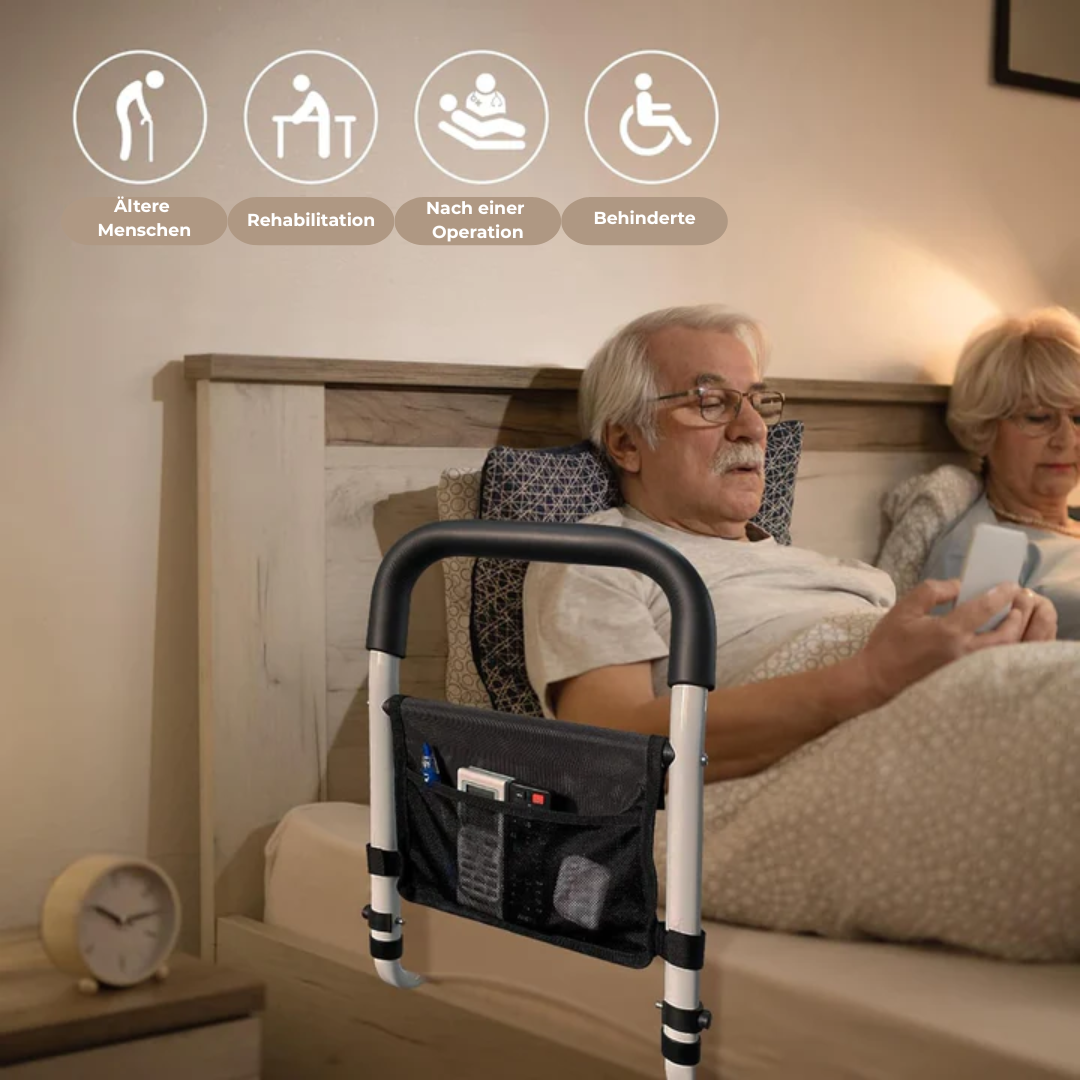 Die BedClip™ Bettstütze bietet zuverlässige Unterstützung für Personen, die mehr Sicherheit und Stabilität beim Ein- und Aussteigen aus dem Bett benötigen – ideal für Senioren, Schwangere sowie Menschen in der Genesungs- oder Reha-Phase. Ihre robuste Konstruktion, der ergonomisch geformte, rutschfeste Griff und die individuelle Höhenverstellung sorgen für höchsten Komfort und maximale Sicherheit. Zusätzlich hält die integrierte Aufbewahrungstasche wichtige Alltagsgegenstände stets griffbereit. BedClip™ ist damit ein unverzichtbarer Helfer für mehr Unabhängigkeit, Sicherheit und Wohlbefinden im Schlafzimmer.