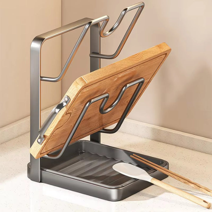 Eine aufgeräumte Arbeitsfläche sorgt für mehr Ruhe in der Küche. Dieser Deckel- & Utensilienhalter bewahrt Topfdeckel, Schneidebretter und Kochutensilien übersichtlich auf. Alles ist gut sichtbar und schnell zur Hand – ideal rund um Spüle und Herd.