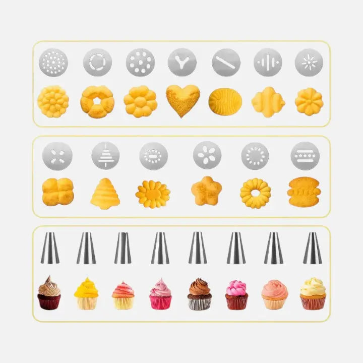 Mit 13 Motivscheiben und 8 Tüllen gestalten Sie klassisches Spritzgebäck, saisonale Motive oder feine Cremedekorationen für Gebäck und Desserts. Alle Teile lassen sich schnell wechseln und leicht reinigen.