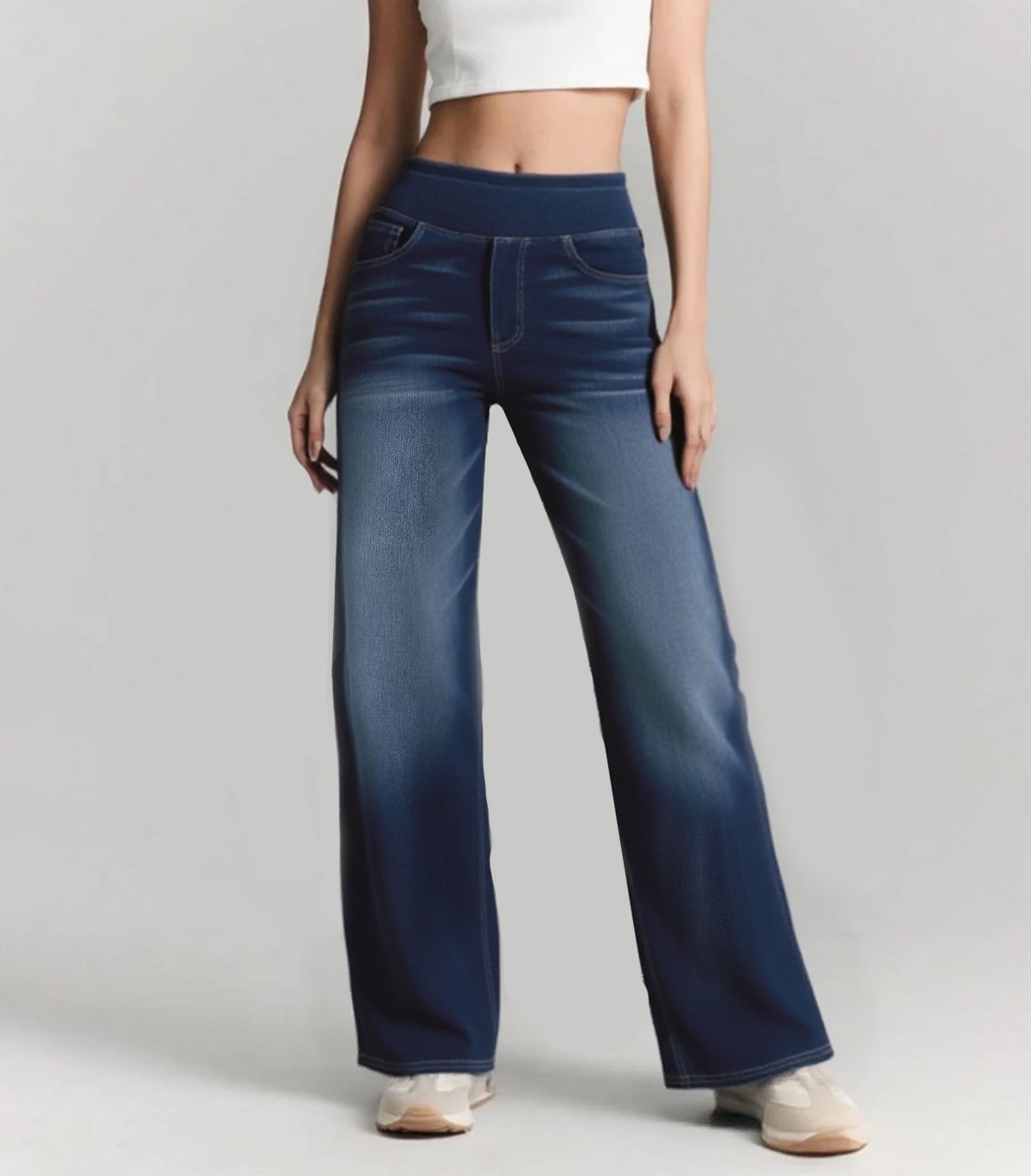Diese High-Waist Baggy Jeans vereint den Look klassischer Jeans mit dem Komfort einer elastischen Knit-Stretch-Hose. Sie formt, glättet und verlängert optisch die Silhouette – für einen lässigen, modernen Style, der jeder Figur schmeichelt.
