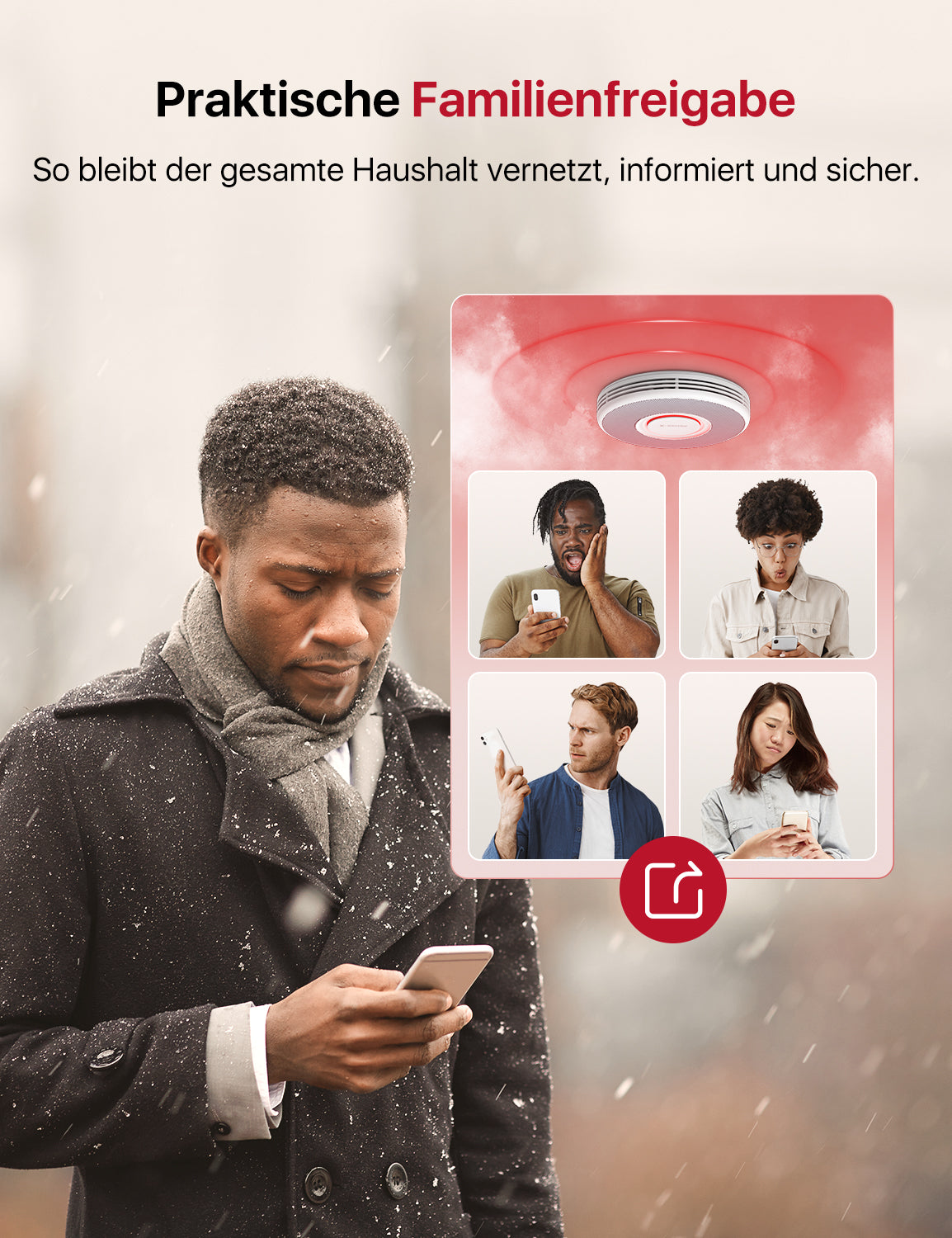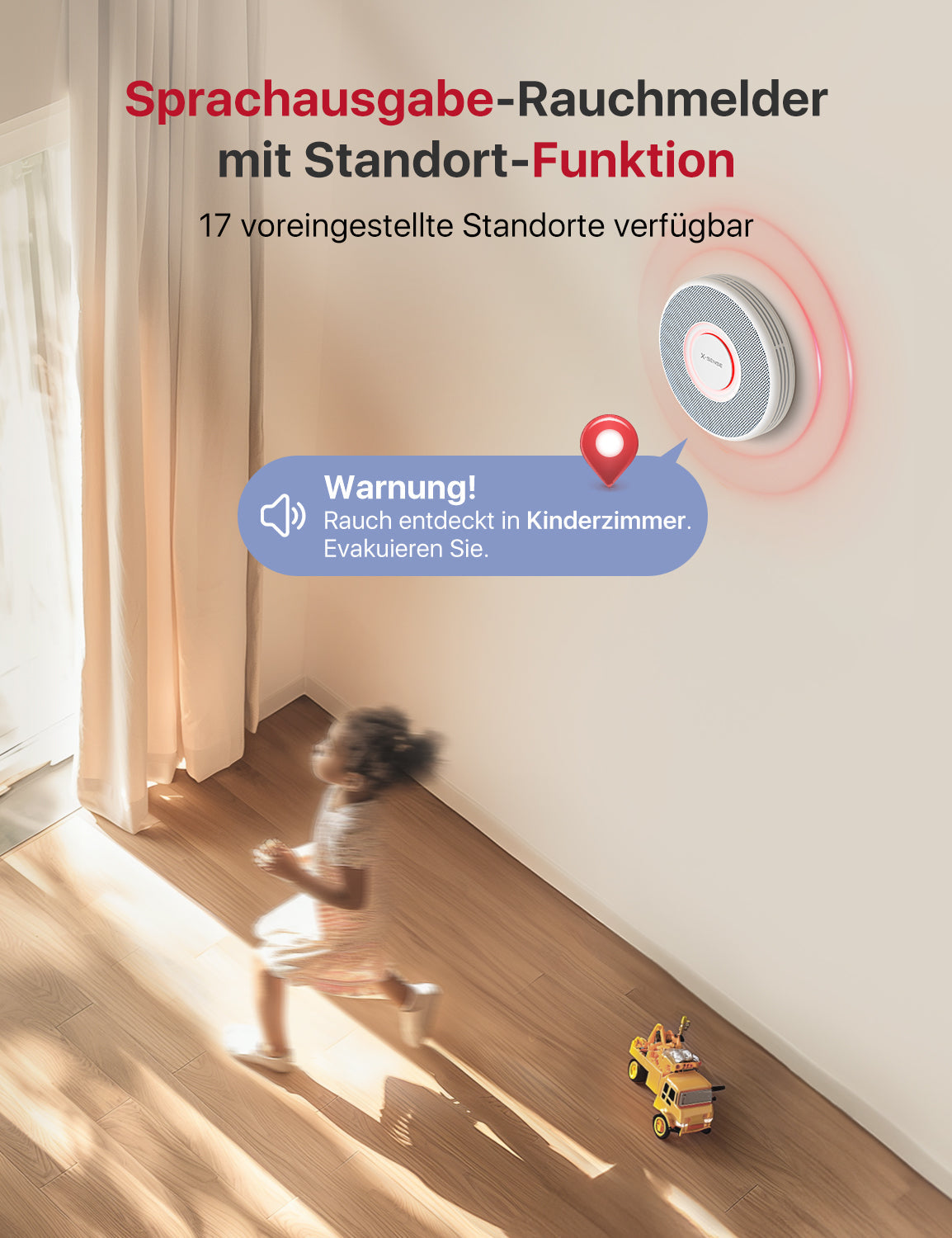 Sprachwarnungen in Echtzeit: Klare Sprachwarnungen wie „Warnung! Rauch im Wohnzimmer erkannt. Evakuieren Sie das Gebäude!“