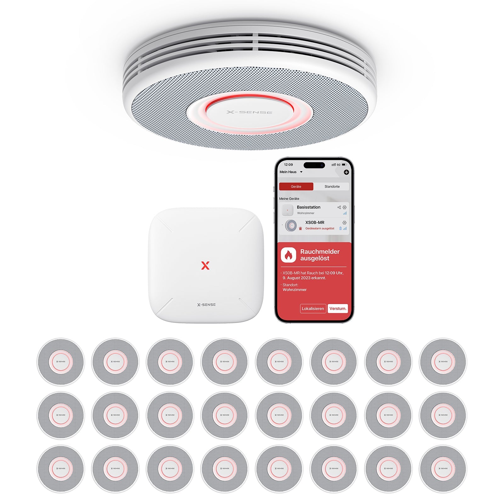 Drahtlos vernetzt: Alle Link+ Pro Alarme, die mit der Basisstation verbunden sind, werden gleichzeitig ausgelöst. Dies umfasst SC07-MR-Kombialarme, XP0A-MR-Kombialarme, XS01-M-Rauchmelder, XS0B-MR-Rauchmelder, XC01-M-CO-Melder und XH02-M-Hitzemelder, die miteinander verbunden werden können.